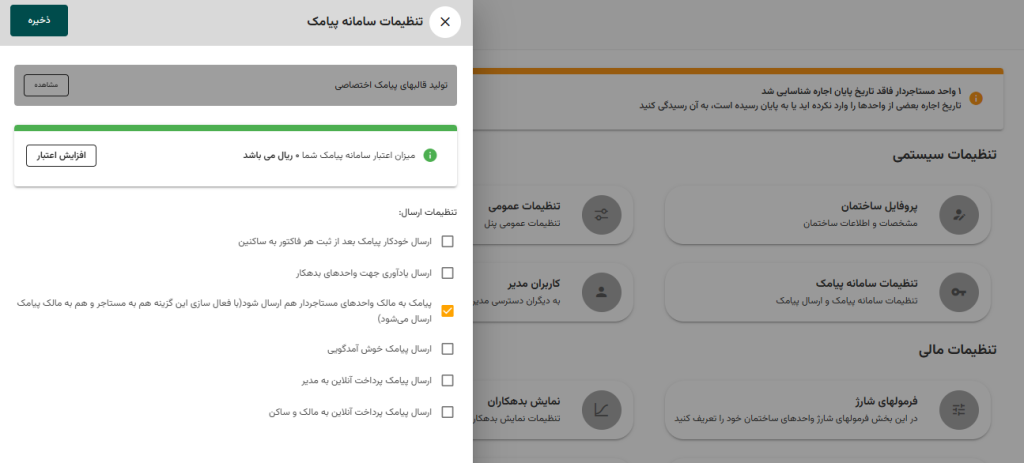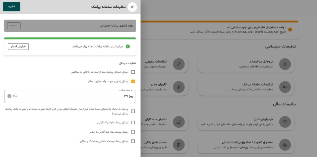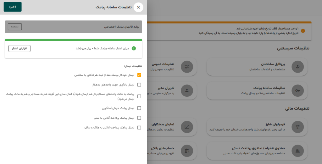 در قسمت تنظیمات ساختمان ، گزینه تنظیمات سامانه پیامک به شما امکان کنترل و تغییرات در ارسال پیام را میدهد .