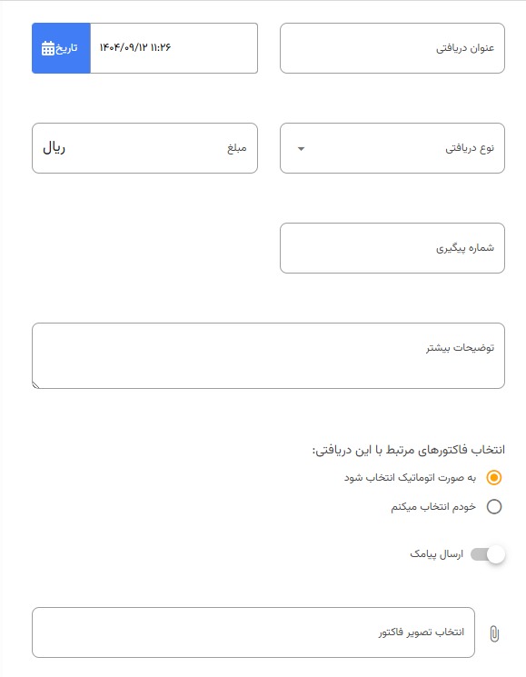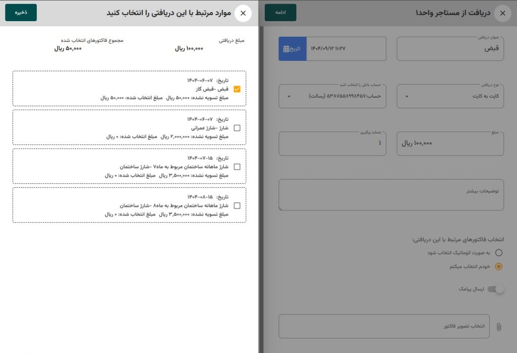 کافی است در بخش گزارش حساب واحد و هنگام ثبت رسید، گزینهی «انتخاب فاکتورهای مرتبط – خودم انتخاب میکنم» را فعال کنید.